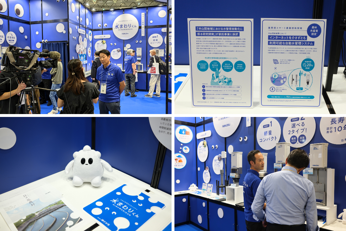 ブースでは「水まわりくん」を中心に展示。実機展示に加え、農林水産省認定と研究開発事業採択に関する内容もパネルでご紹介。 初日からNHKの取材を受け、インタビューや撮影の対応で大忙し。3日間で36,617人もの方が訪れ、当社ブースも官公庁の担当者、営農法人関係者、個人農家さんを中心に大盛況で終えることができました。 今後も拡販に向けた認知度アップのための活動を活発に行い、企業イメージの向上にも貢献できるようにしていきたいですね。