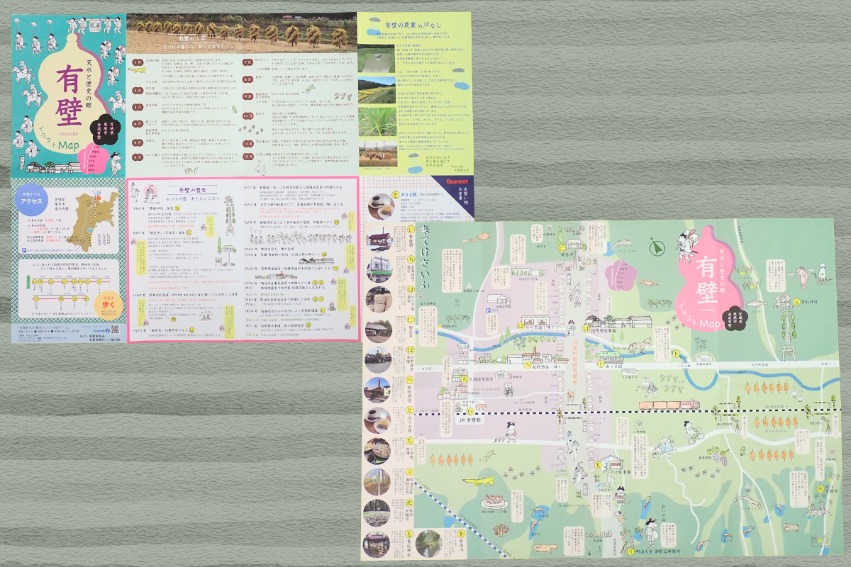 冊子を開くと、各スポットに丁寧な説明やほっこりするイラストが添えられた有壁地区の地図や 1年の行事、歴史、農業、観光情報など、これを見れば有壁地区のすべてが分かる! といっても過言ではないほど盛りだくさんの内容になっています。