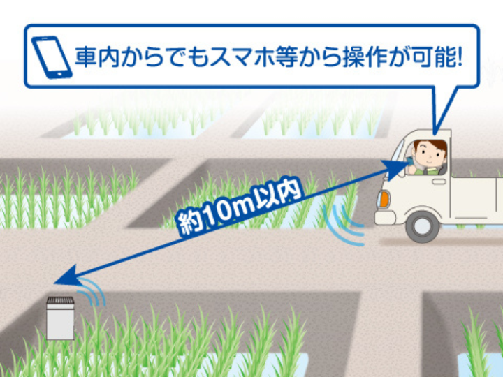 機側設定型では本体の直接操作のほか、Bluetoothを利用し、ほ場の近くでスマートフォンから操作ができます。給水計画を一度設定してしまえば、計画通りに自動で給水・止水を行うので毎回ほ場に行く必要はありません。付属の水位センサーと連携し、水田の水位を自動的に制御することもでき、設定した水位に応じて、水田に適切な量の水を供給します。これにより、人手による水管理の手間を大幅に削減できます。