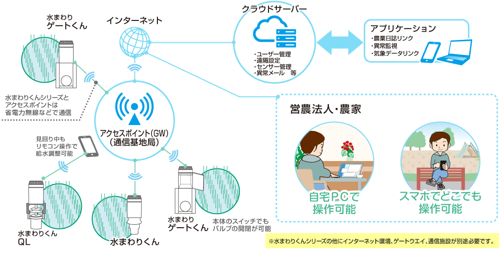 クラウド技術を活用することで、水田の水位や水温、給水システムの状態などを、パソコンやスマートフォンから遠隔で監視・制御することが可能になります。これにより、圃場に行かなくてもどこからでも水管理ができ、作業の効率化に繋がります。