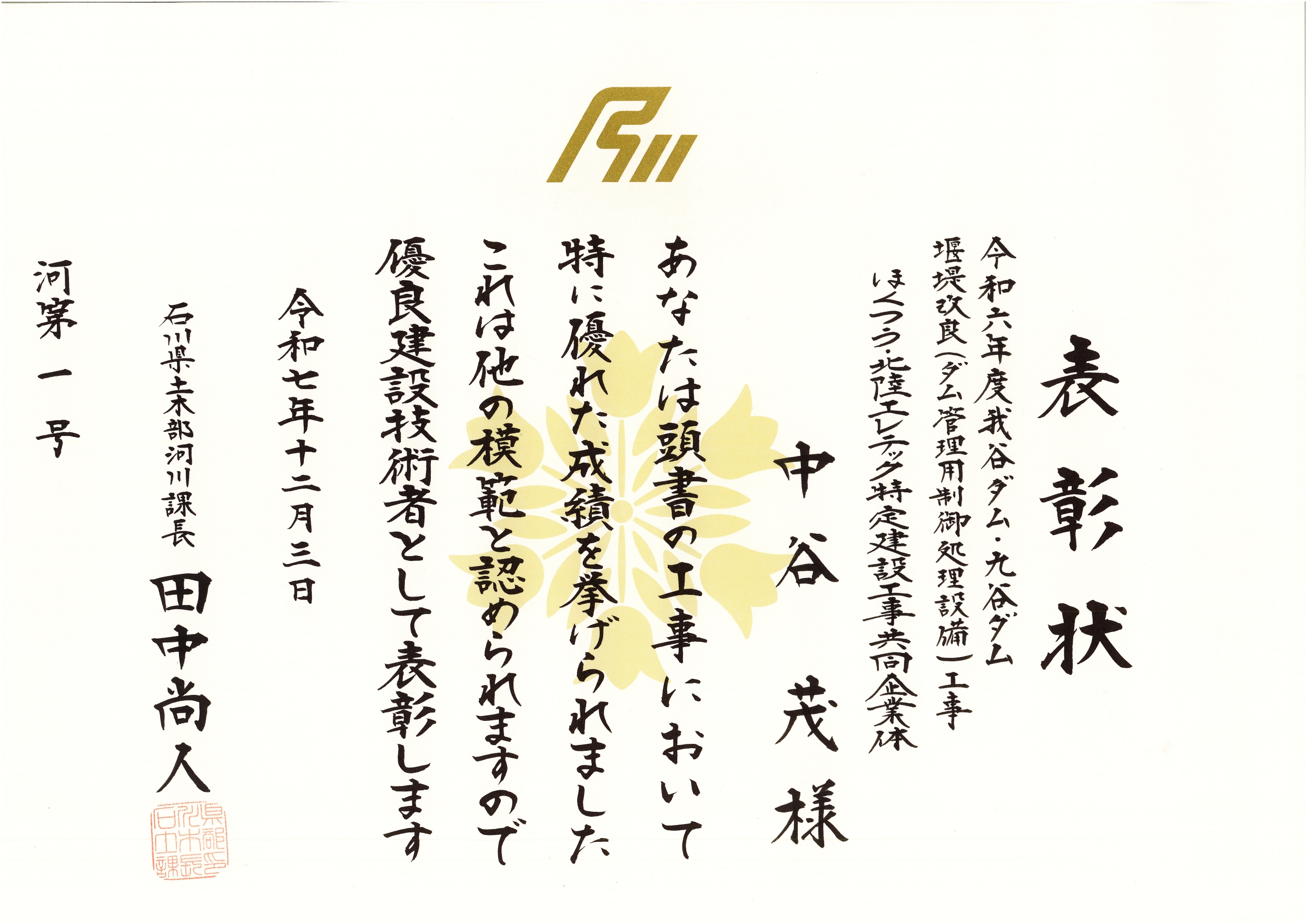 石川支社 技術部 社会インフラ技術一課 第二係 中谷 茂さんが優良建設技術者として