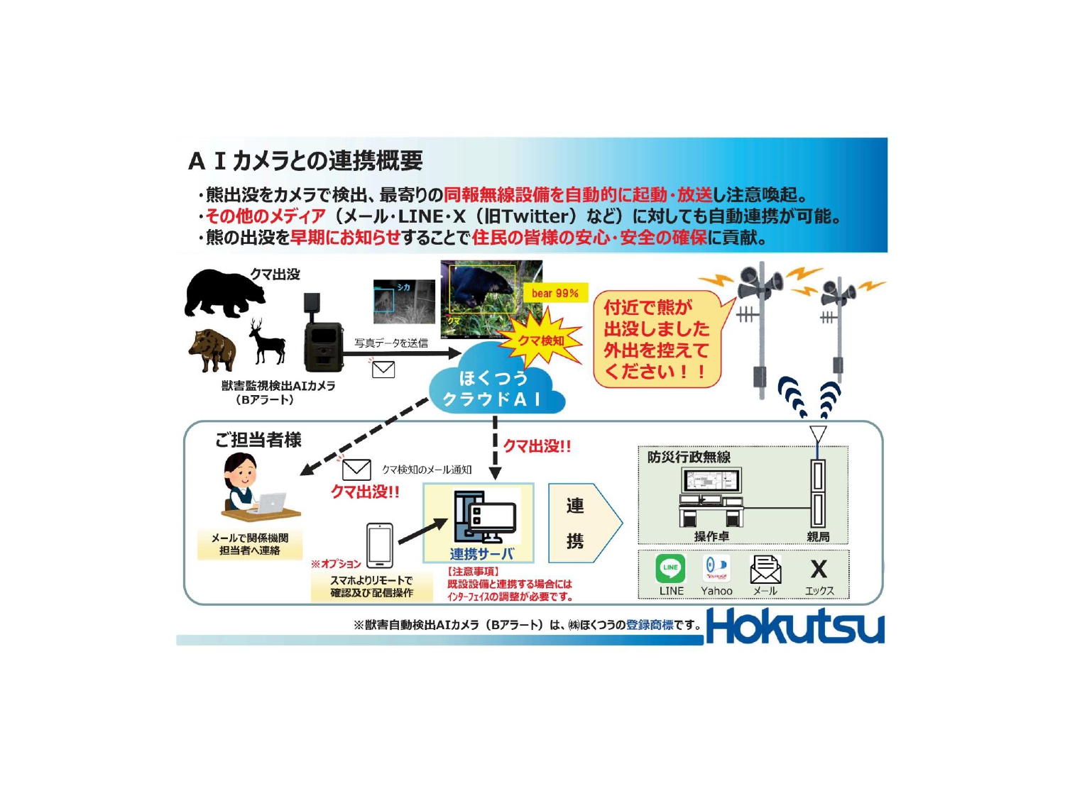 害獣自動検出AIカメラ(Bアラート)と同報系防災行政無線を自動連携するシステムを構築し、